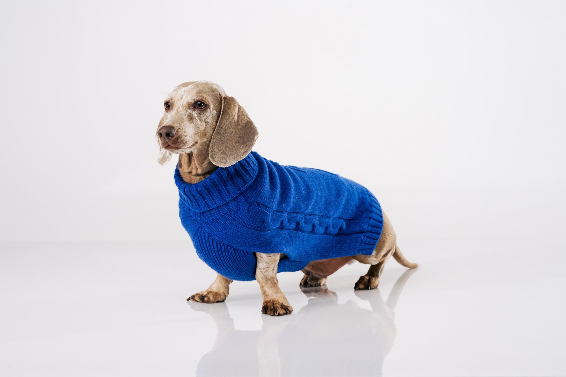 Wrap your pup in premium warmth with this soft 3-thread cashmere sweater. Featuring handmade finishes in a rich royal blue, textured diamond cable knit design, and ribbed edges for a tailored yet comfortable fit. A discreet, reinforced back opening allows for easy leash attachment to a harness or collar, keeping your pet comfortable and secure on every walk. Stylish, cozy, and perfect for cooler days.