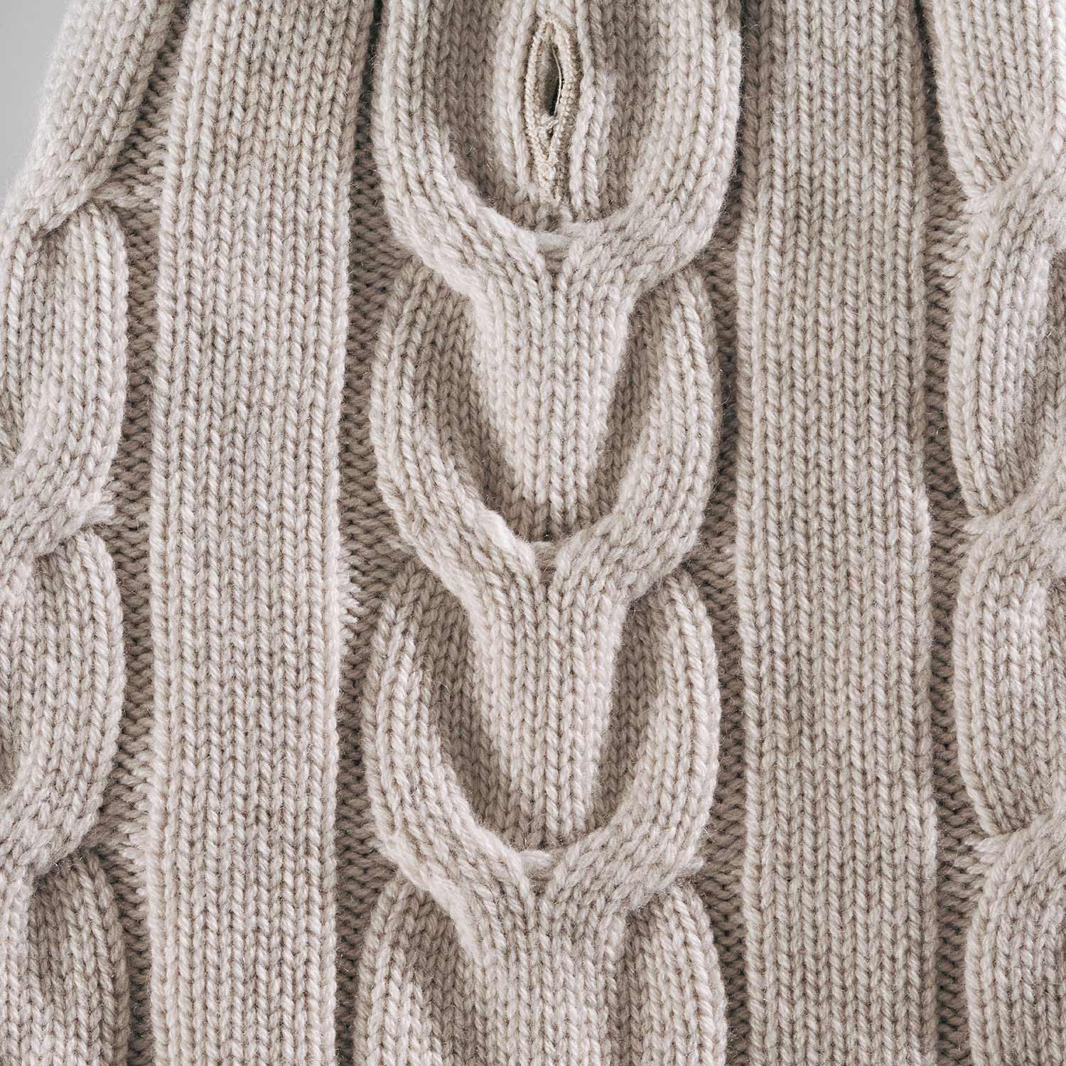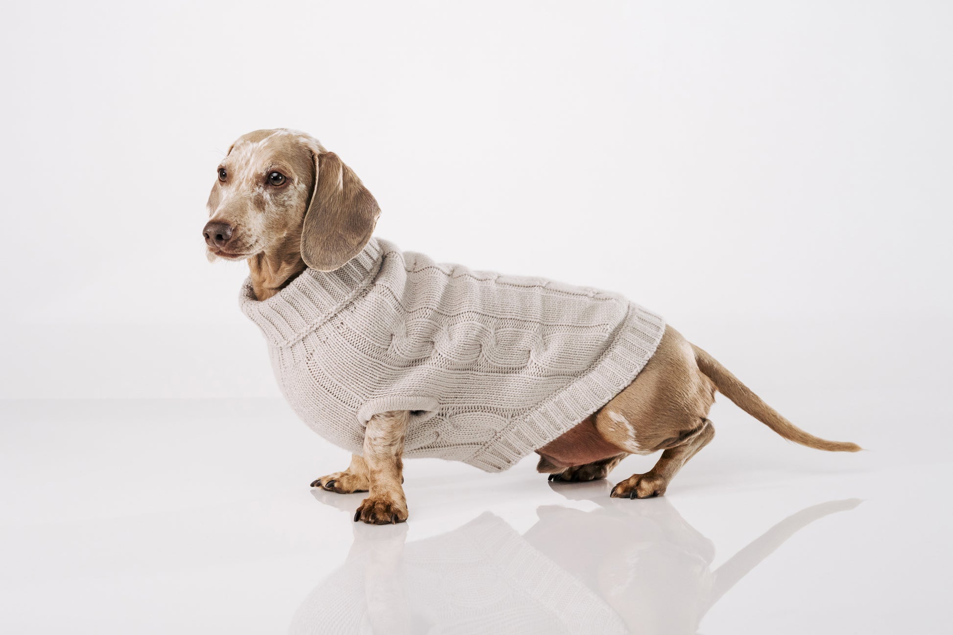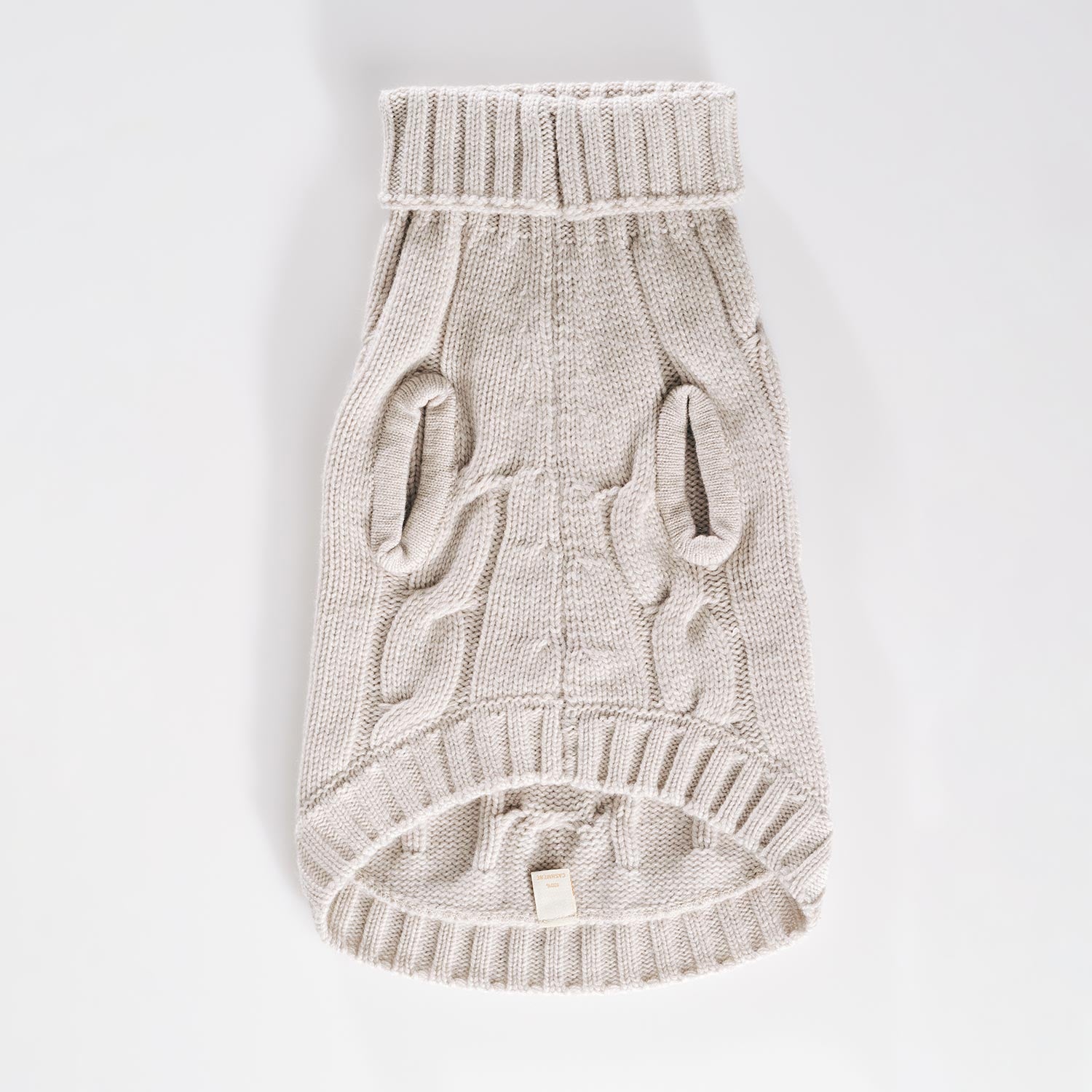 Luxuriously thick and irresistibly soft, this 5-thread cashmere sweater features a timeless cable knit design in a beautiful beige. With ribbed edges, handmade finishes, and a cozy turtleneck, it offers ultimate warmth and elegance for chilly days. A reinforced leash access opening on the back ensures you can connect to your pet’s harness or collar without compromising comfort or style.